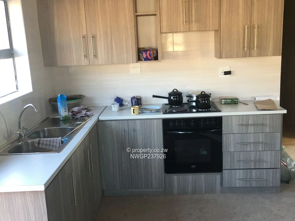 Charming 3-bedroom house for rent in Matsheumhlope, Bulawayo East — ideal for a family or professionals seeking comfort and reliable services. As seen in the photos, the single-storey home has a neat rendered exterior with a tiled roof and a welcoming front porch overlooking a tidy yard with young shrubs. The modern fitted kitchen features wood-effect cabinetry, a built-in oven and hob, generous countertops and a double sink — perfect for everyday cooking. The property benefits from its own borehole and visible green water storage tank, ensuring dependable water supply and reduced reliance on municipal interruptions. Ample open outdoor space offers secure parking, room for a garden or children's play area, and easy access to the side service area. Fresh finishes throughout and large windows provide good natural light and ventilation. Quiet neighbourhood in Bulawayo East with convenient access to local amenities. Contact now to arrange a viewing and make this well-appointed, water-secure home your next rental.